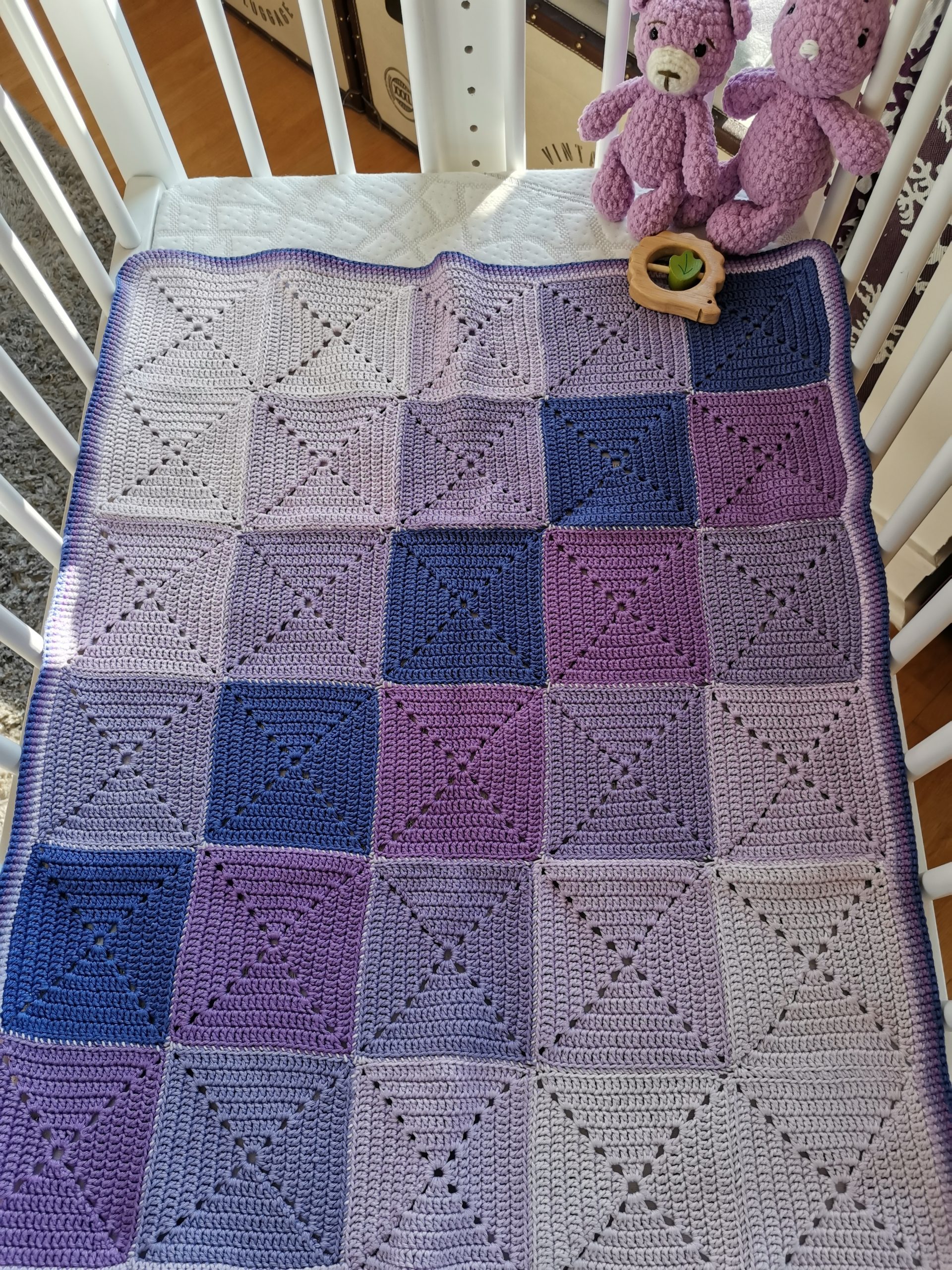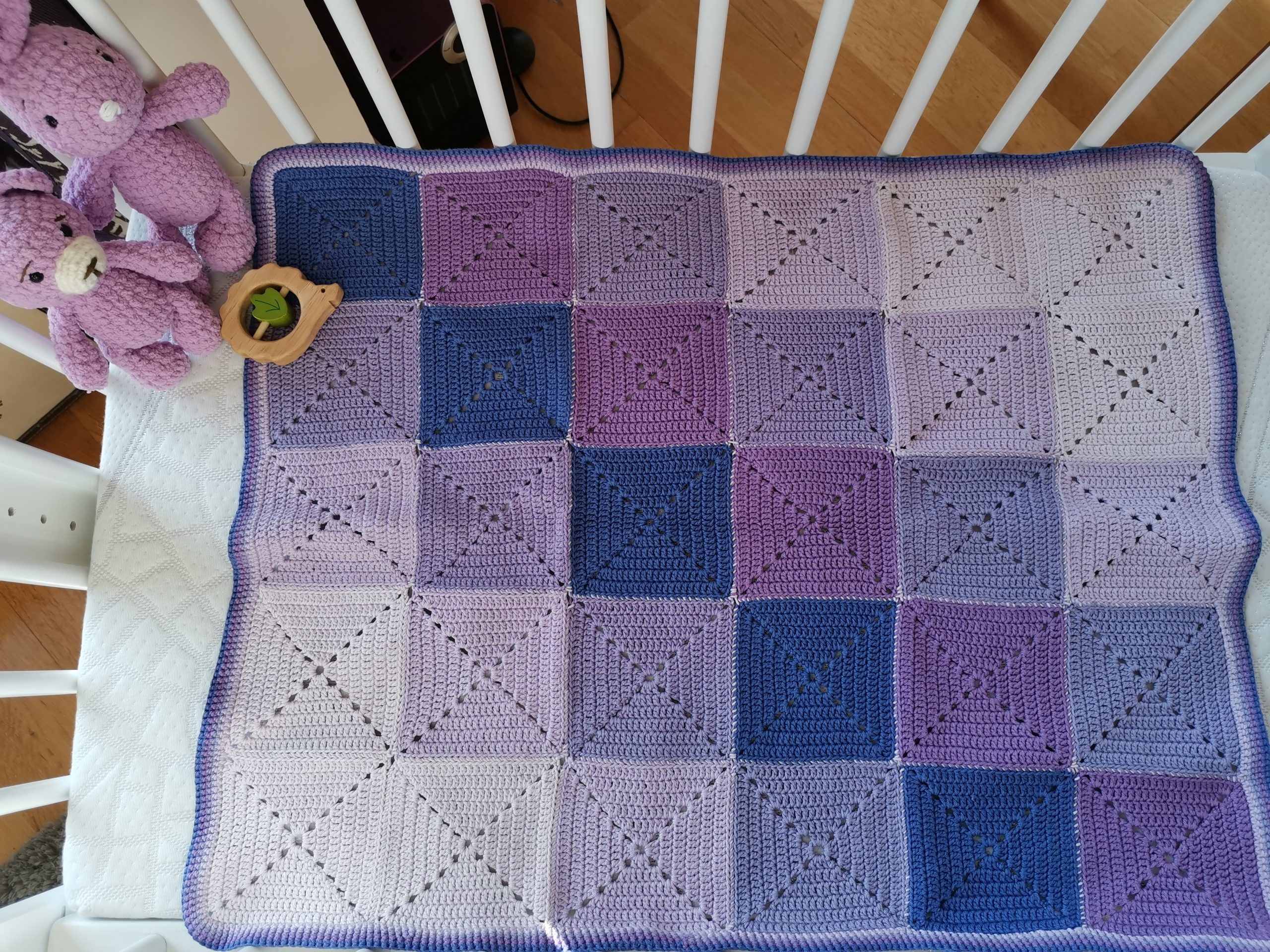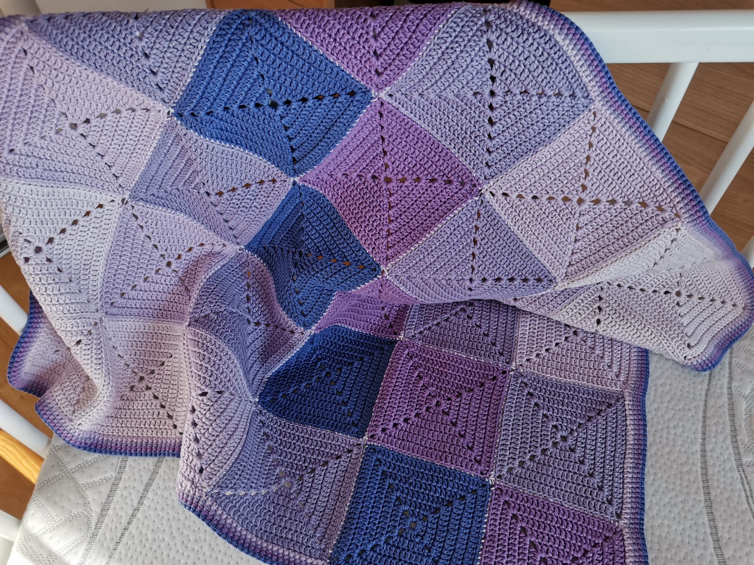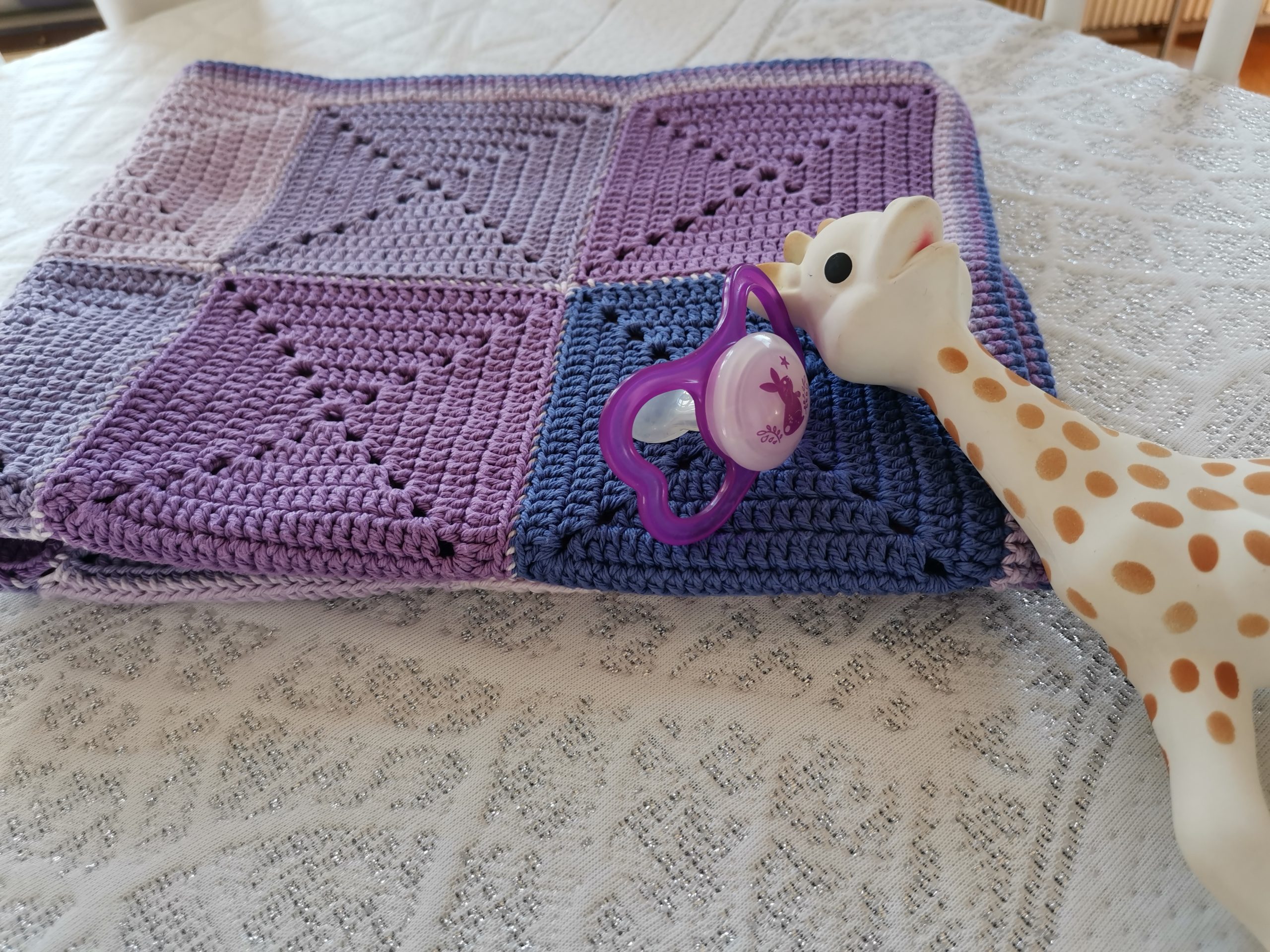 Un camaïeu de mauve pour cette couverture composée de 30 carrés.