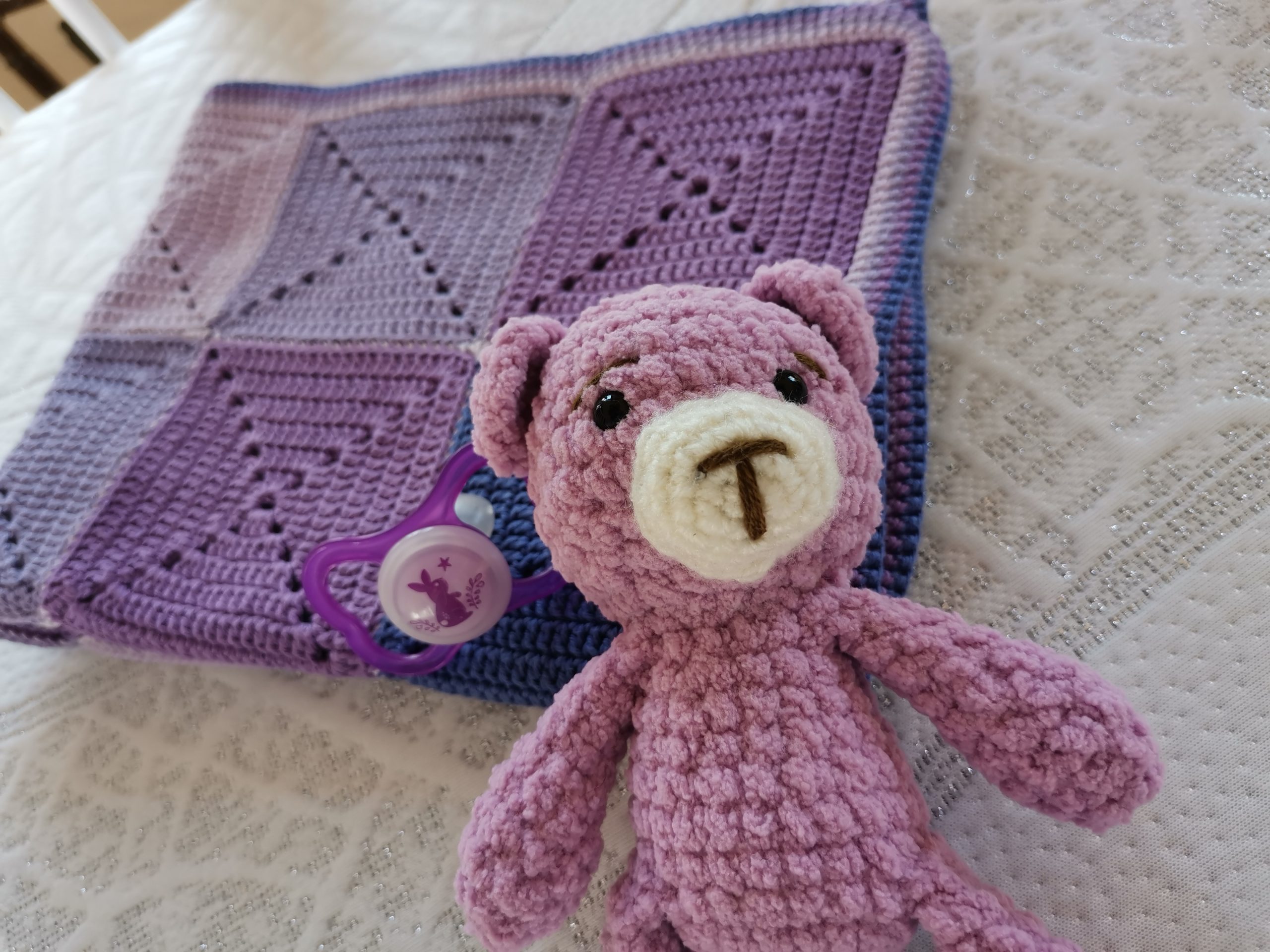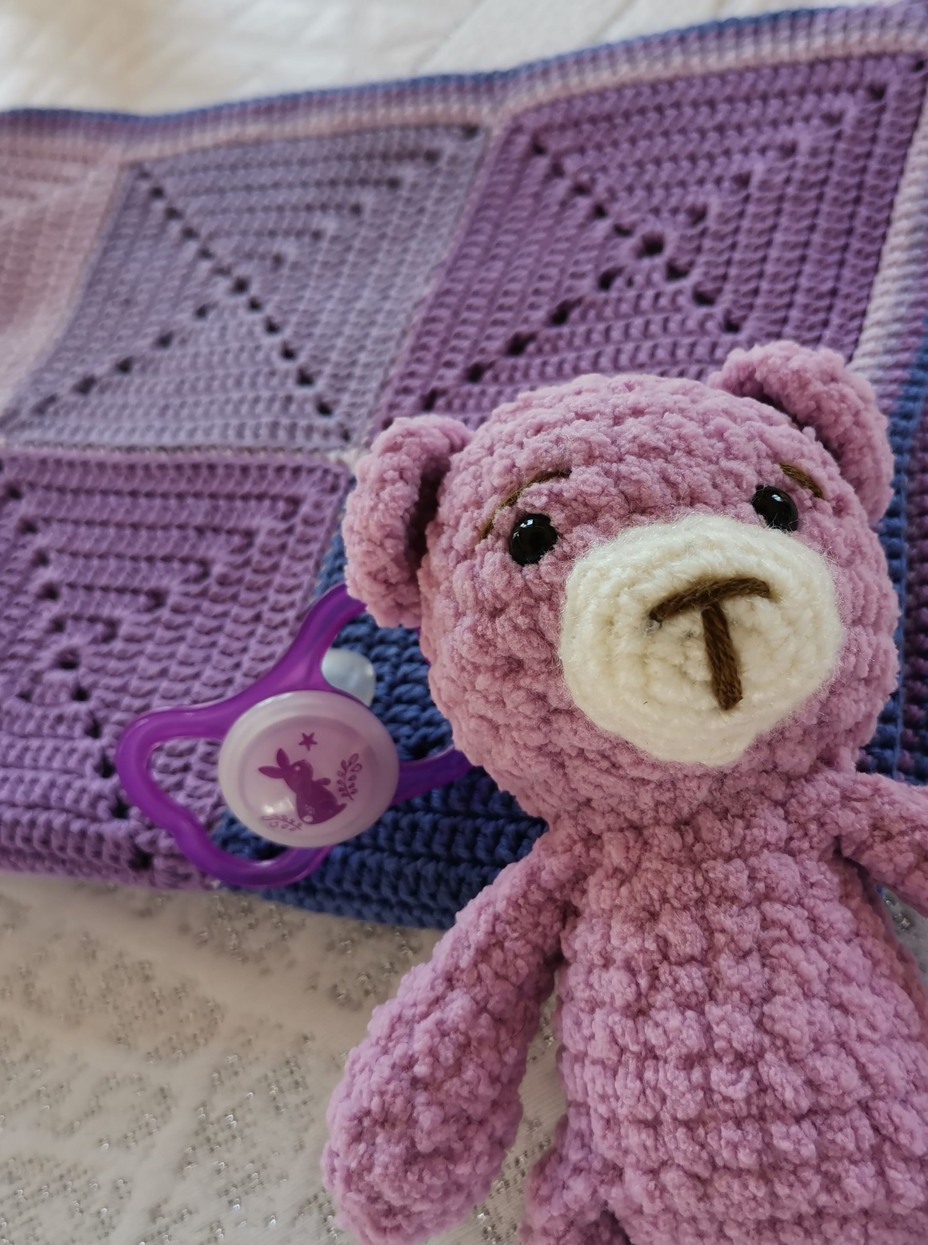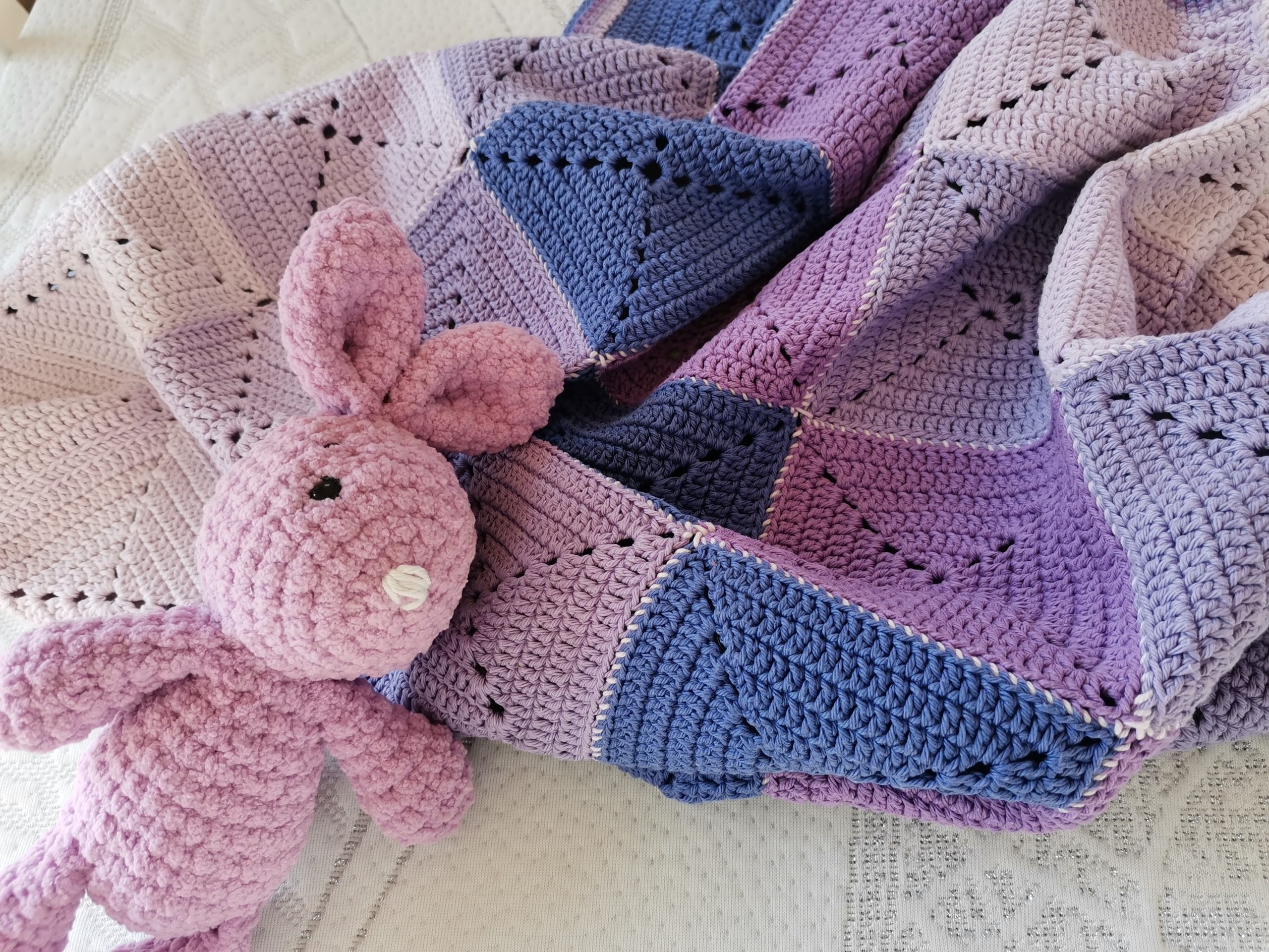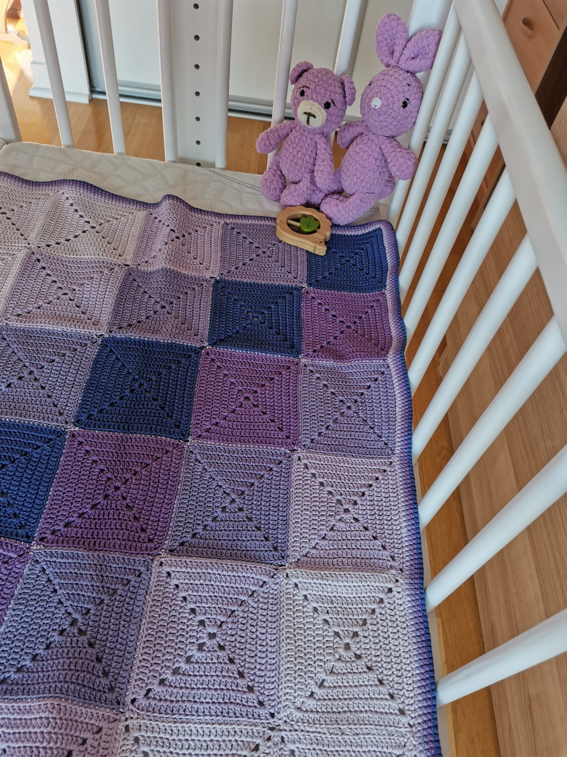 Un camaïeu de mauve pour cette couverture composée de 30 carrés.