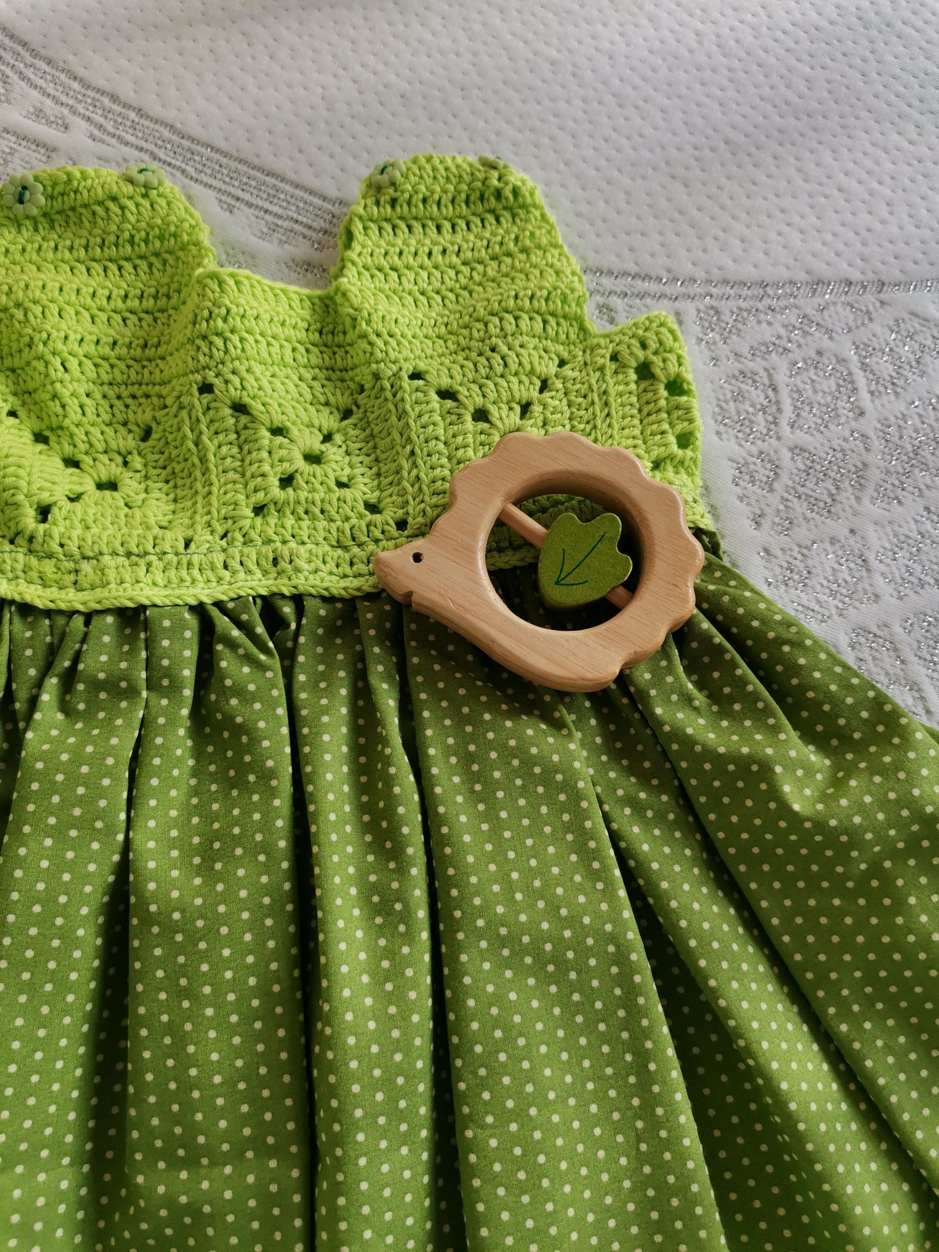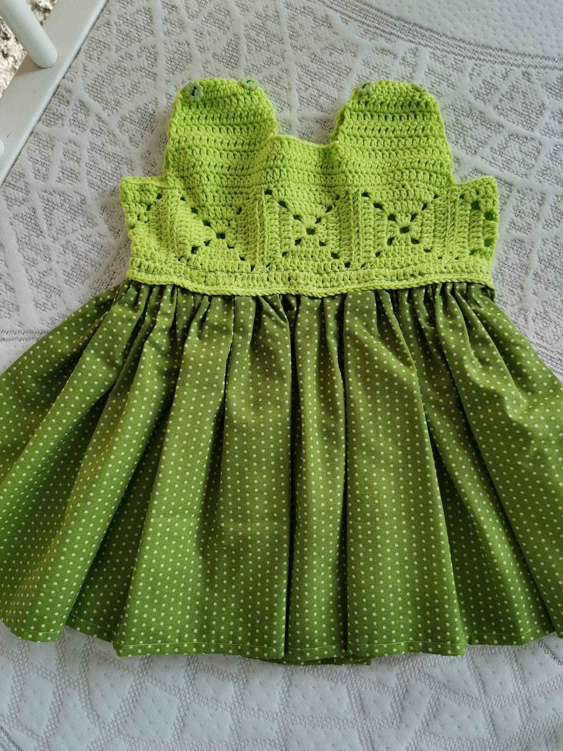 Une robe sans manche qui allie crochet et tissu, le tout en 100% coton biologique, parfait pour l’été. Avec des matières achetées à Madagascar et une confection toute à la main. Facile d’entretien, la robe est lavable en machine jusqu’à 40° et gardera toute sa souplesse si vous utilisez un fer à repasser une fois sec. Ne pas utiliser de sèche-linge. Encolure carrée avec des petits boutons de chaque côté des épaules et un tissu fleuri pour la partie jupe.